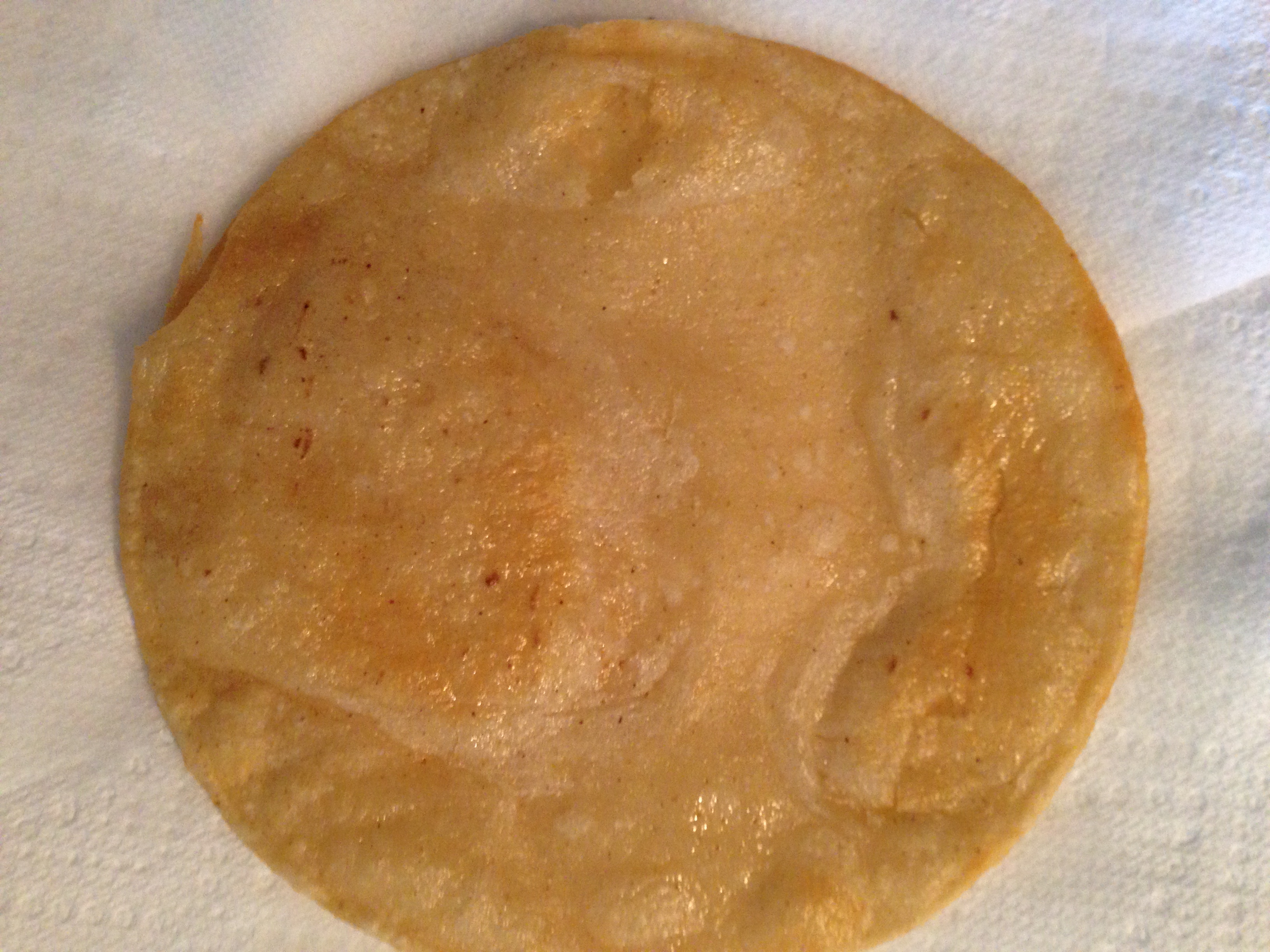 In a small skillet, heat and melt a few tbsps. of refined coconut oil (the refined oil eliminates the coconut taste) or use Canola oil over medium heat. While heating, prep a large plate with a few paper towels to soak up any extra oil on the bottom of the tortilla and have a few on hand to dab up the oil as well from the top side of the corn tortillas. Once the oil is heated, submerge a corn tortilla, one at a time, and fry until golden brown and crispy. It should look like so: