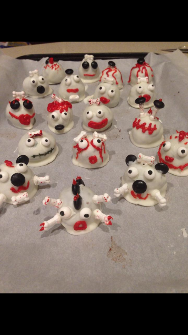 Once the balls are frozen, stick the lollipop sticks in the middle of each ball. Melt candy melts until smooth. Working quickly, submerge each cake pop into the candy coating and return to the same parchment lined baking sheet. Once finished, carefully remove the lollipop sticks. Reheat the candy melt, if needed and add a small amount to the M side of the M&M and place on the hole of the cake ball. Using the red gel icing, make squiggly lines to get the desired blood shot eyes. For the cake pop critters, let your kids go to town & be creative.