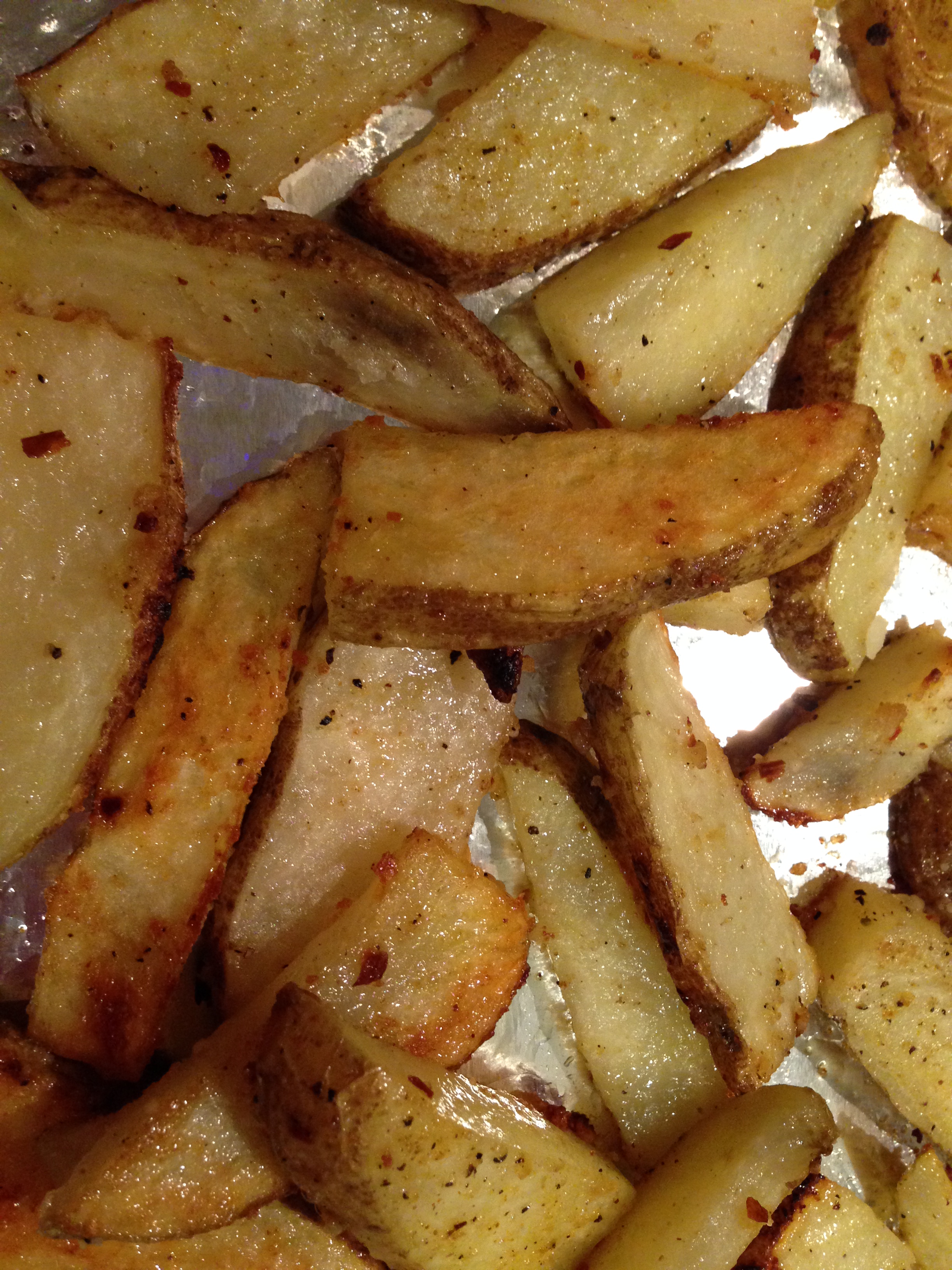 Preheat oven to 450 degrees. Line a baking sheet with aluminum foil and spray with non-stick spray. Set aside. Wash and pat dry the potatoes. With each potato, quarter and then cut each quarter into wedges. Once cut into wedges, add all the potatoes into a large bowl. Drizzle with olive oil and then add generous amounts of desired seasonings. We tend to like some spice and heat to ours, so I’ve used chili powder, paprika, and even cayenne pepper. I’ve also used a packet of dry ranch before. You get the idea, use whatever sounds good to you. Since potatoes have a tendency to absorb salt, add more than you normally would. Using your hands, mix together the potatoes and seasonings to fully incorporate onto each wedge. Spread out onto prepared baking sheet. Bake for 10 -12 minutes, remove from oven, and using a spatula, turn wedges over onto the other side. Return to the oven and bake another 10 -12 minutes or until desired crispness and/ or golden color is achieved.