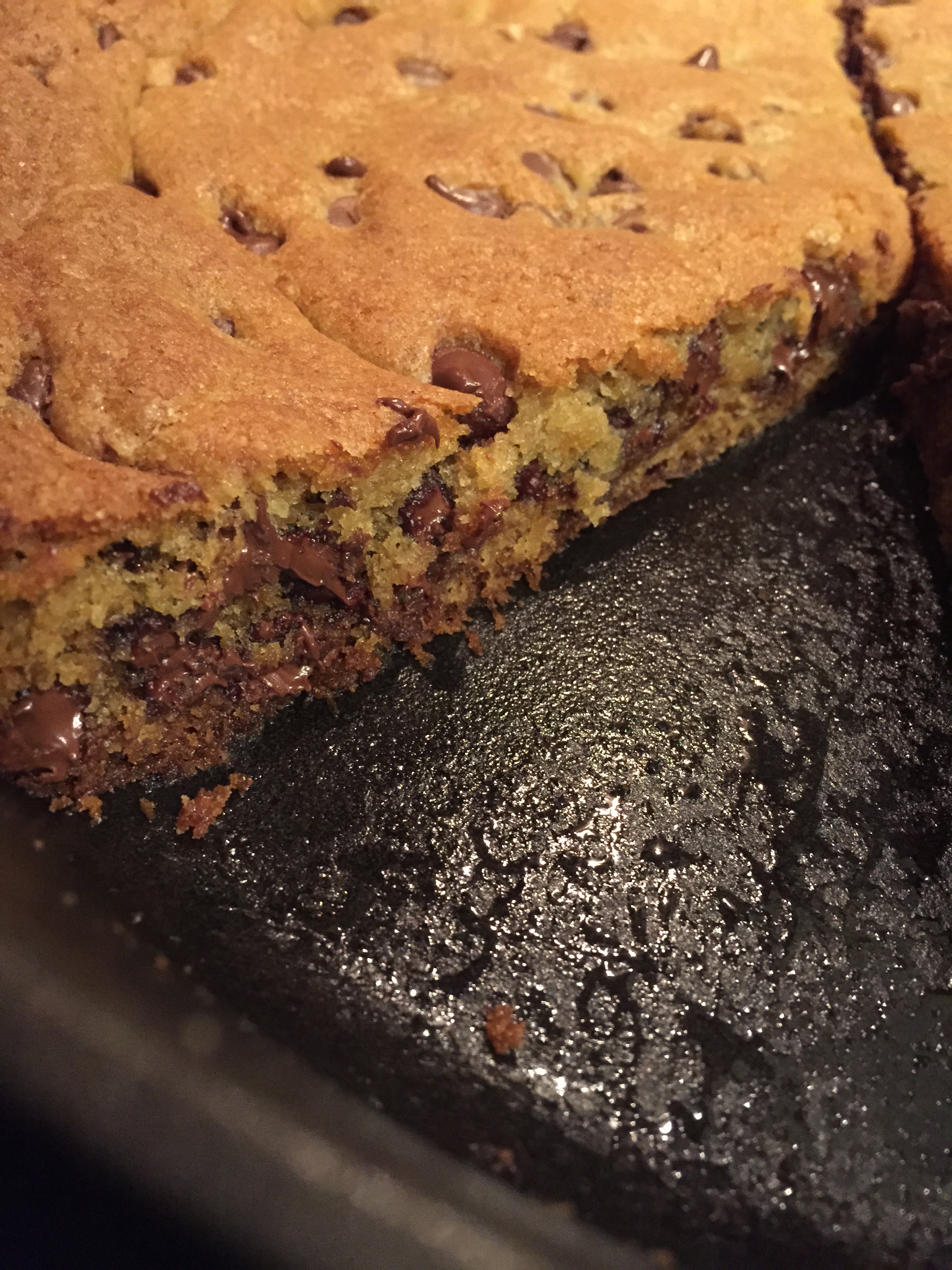Press the mixture evenly into the skillet. With the remaining chocolate chips, sprinkle around the top and gently press in. Bake for 20 – 22 minutes to ensure the middle is set. Remove from oven, cool, or slice and serve.