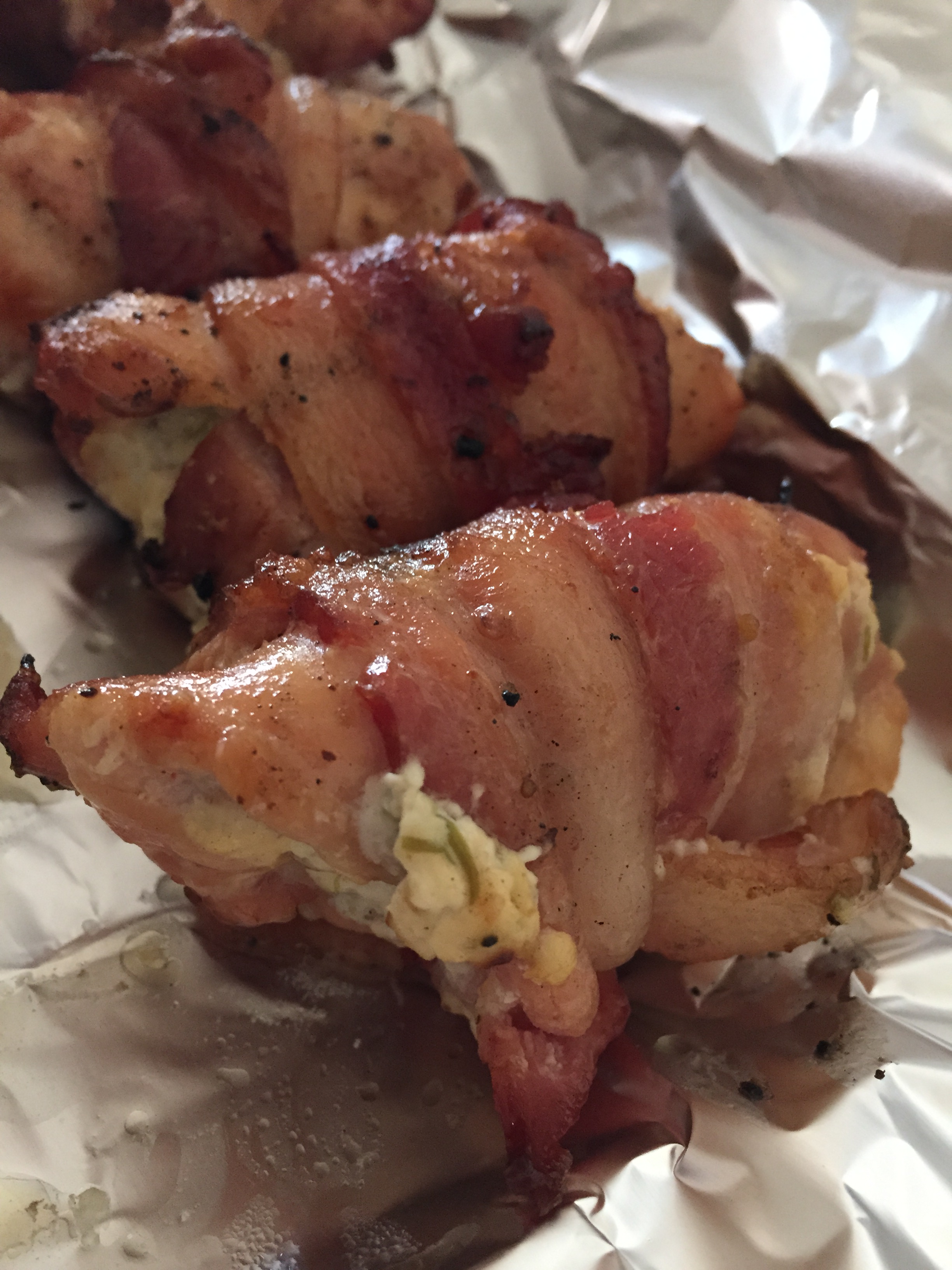 Place chicken loosely in a gallon size bag and pound thin. Season the chicken on both sides with freshly ground salt, pepper, & garlic pepper. Spread a thin layer of the cream cheese with chives and roll up. With a slice of bacon, wrap around the rolled chicken, tying in a knot. Grill accordingly or bake in an oven set to 350 degrees for 40 – 50 minutes, or until there is no pink when cut into the chicken.