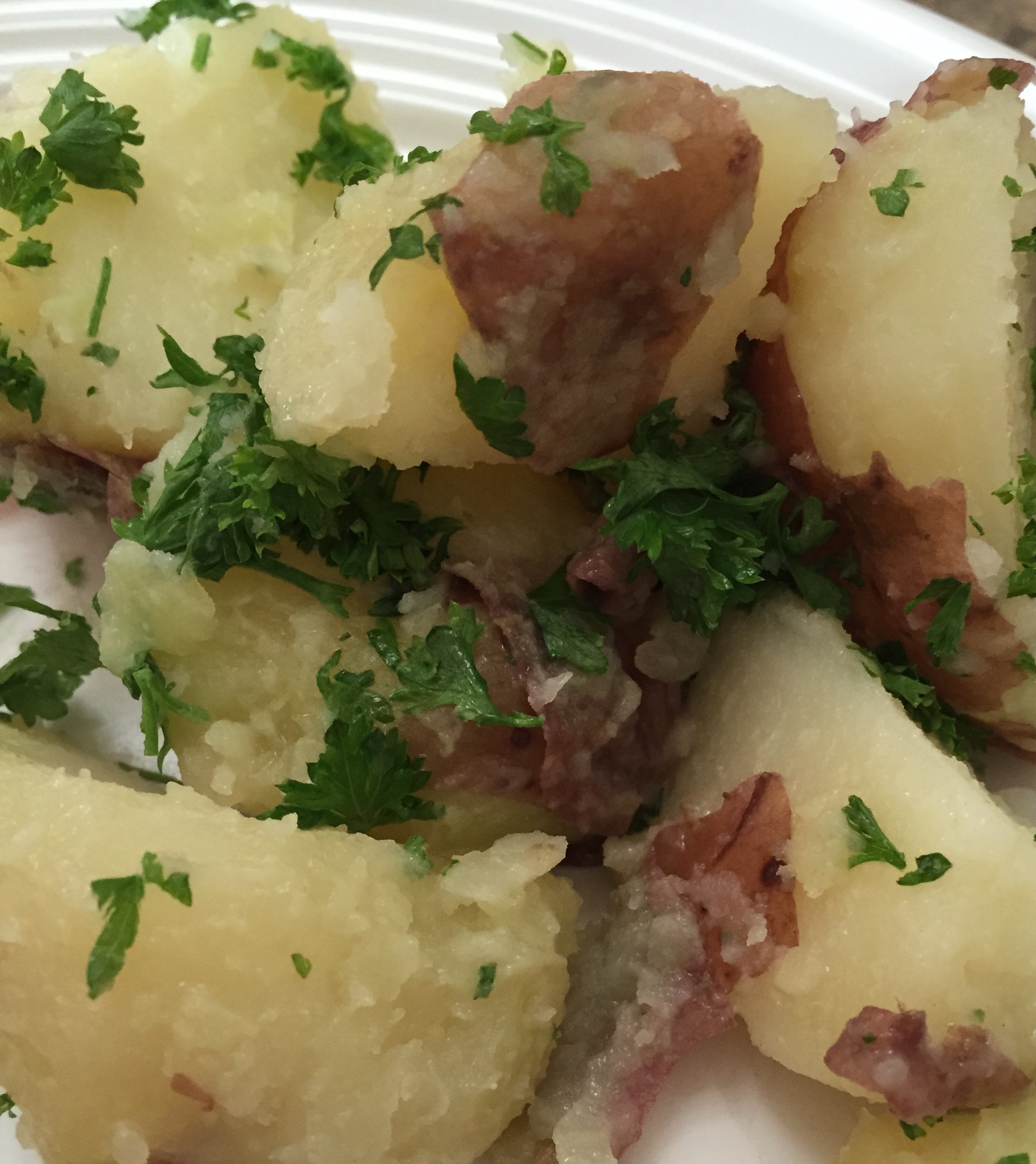 In a large pot, bring the water to boil. Gently add the potatoes and cook for 8-10 minutes, or until a fork can be inserted (somewhat easily) into the potato. Drain the potatoes into a colander, and once the water is drained, place the potatoes back in the pot. Drizzle with the butter, add a few grinds of freshly cracked kosher salt, add the parsley, and stir lightly to coat. Serve immediately.