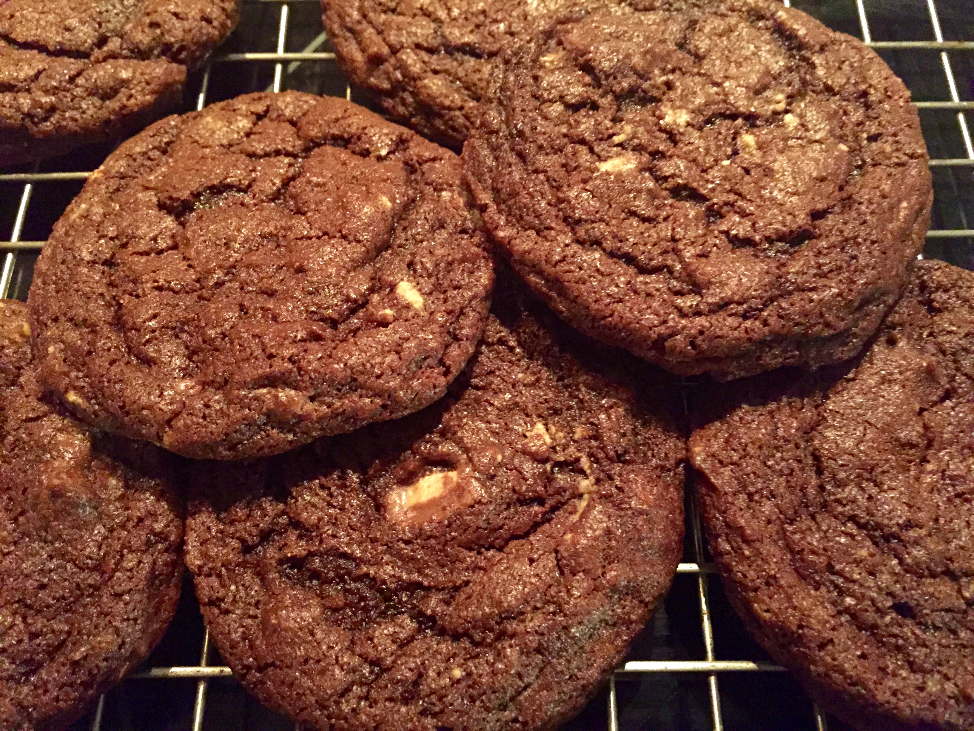We attended a BBQ this past weekend and the host’s only request was to bring a side. When I looked at the forecast and discovered it was going to be 100 degrees, cookies instantly came to mind. They’re portable and you don’t have to worry about them being refrigerated or maintained at a certain temp for fear of food poisoning. Because, you know, food poisoning is so much fun, said no one ever. Plus, it was an opportunity to try something new. A chocolate cookie with chopped mini Reese’s PB cups. There’s also the upside of baking, sampling, and leaving the cookies to the masses so they’re not lingering around the house calling out my name like they sometimes do.