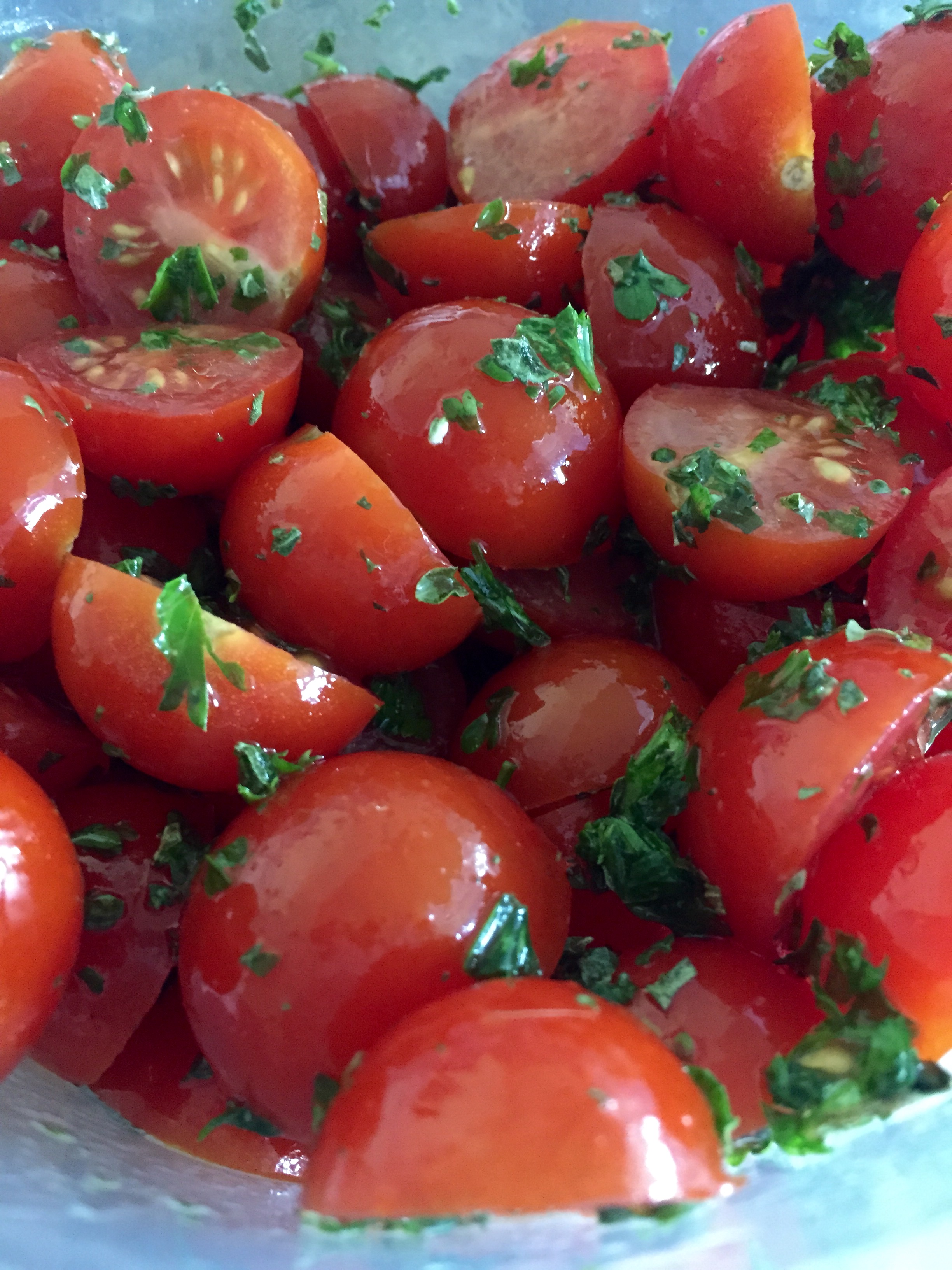Place tomatoes in a bowl. In a small bowl, whisk together the oil, vinegar, salt, and sugar until emulsified. Stir in fresh herbs. Pour over tomatoes; gently stir to coat. Cover and refrigerate overnight.