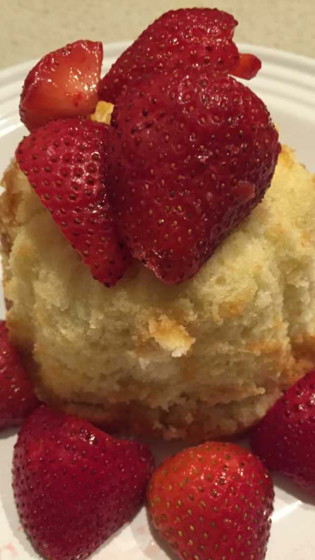 I have a flash drive and one of the folders in it contains endless recipes that I think sound good, that someone in my family would like, that I want to try, and so on and so forth. Some of the recipes have been in there for years; always with the intention that someday I will make it. I finally got around to making one of them. I was especially ambitious because I thought what a fantastic idea it would be to buy a mini bundt pan and turn what would be one big cake into lots of minis except then I filled the mini pans too full so they were more like great big cupcakes because there was no hole in the middle. Also, despite greasing the pan with what I thought was well enough, turned out not to be so great, either. Translation: I struggle sometimes. Aside from aesthetics, these were still pretty tasty and the mistakes were somewhat hid by strategically placed strawberries. Had I had some fresh whipped cream, these would have made for some super cute shortcakes.