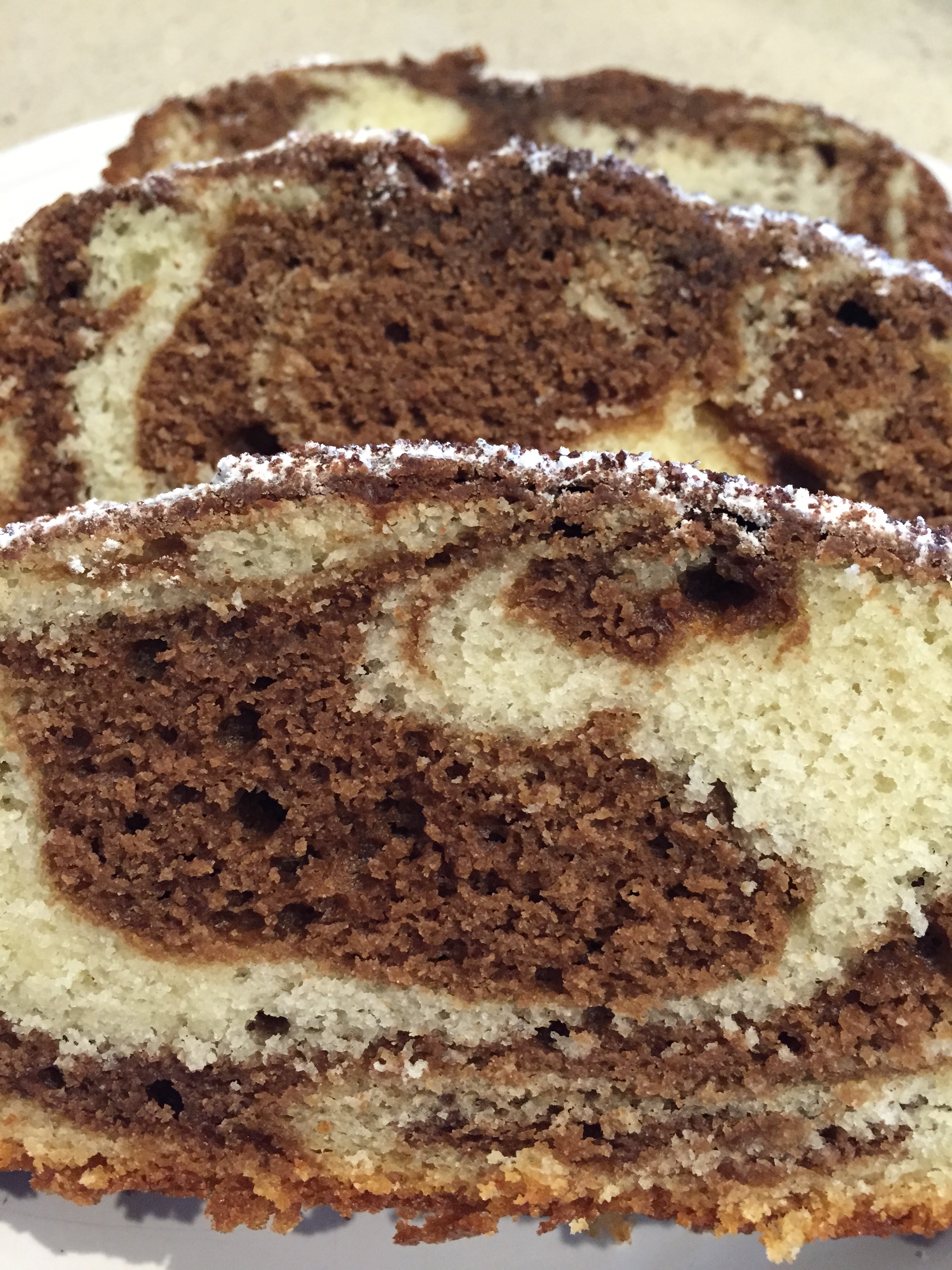 Spread half of the remaining white batter onto the bottom of the prepared bread pan. Then add half of the espresso batter onto the white batter, smoothing as you go, but being careful to not mix the two layers. Repeat the process with the remaining white and espresso batters. Using the handle of a wooden spoon, drag through the batter a couple of times to create the swirling effect.