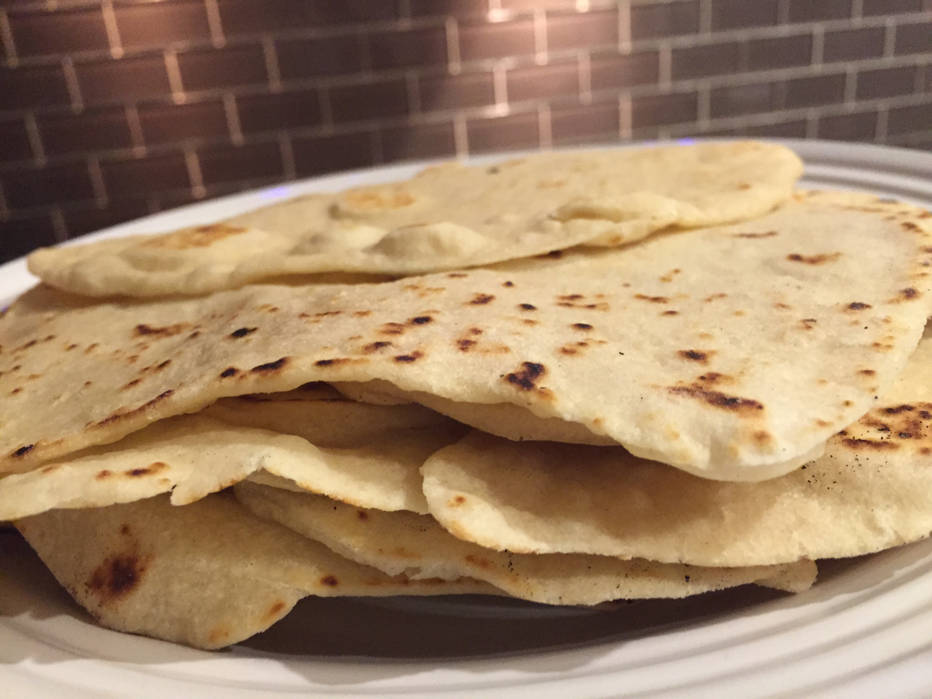 After the resting period, heat a large griddle to medium-high heat and allow to get very hot before using. Once it’s hot enough, use a well floured rolling pin and a floured surface, roll out one dough ball at a time until thin. Transfer to the hot griddle and cook for 1 minute or so before flipping to the other side for 30-45 seconds. Since every stove is different, you’ll learn quickly if you need to reduce the heat or cook longer. With mine, after the first couple of tries, I found raising the heat to almost high and cooking for a bit longer, warranted the results I was aiming for.