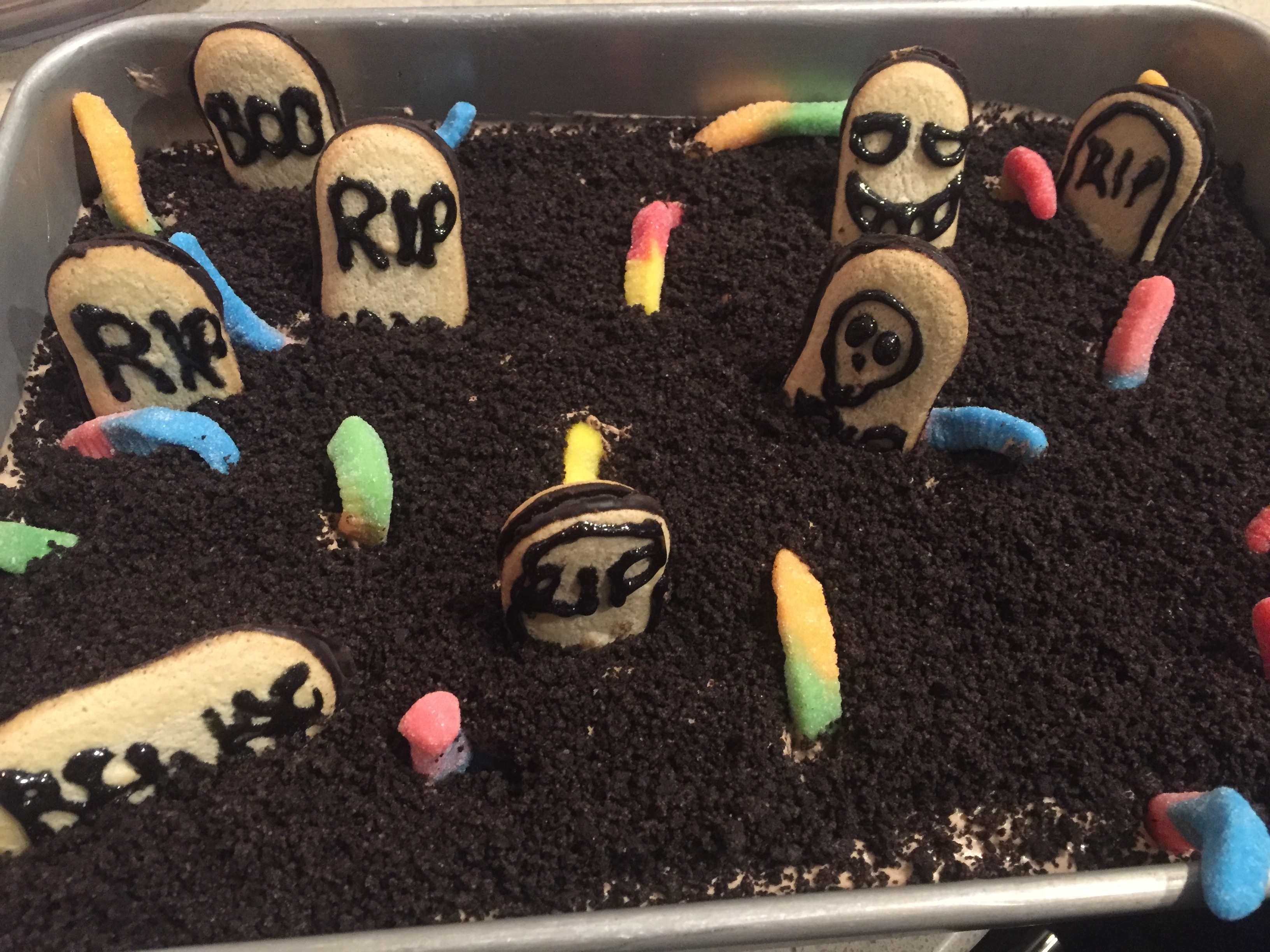 Decorate the Milano cookies accordingly the edible gel and place throughout the pudding. Insert gummy worms into the pudding. Refrigerate for 1-2 hours before serving.