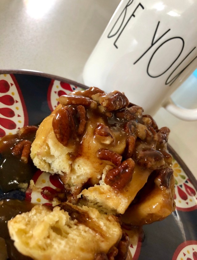 Bake at 350 degrees for 40 – 45 minutes, or until thermometer inserted in middle reads 190 degrees. Remove from oven, allow to cool in pan for 20 minutes. If you have a dish long enough, invert pan so caramel/ pecan sauce is on top. I do not have one of these so when I served them I simply inverted a roll onto the plate. Whatever is not eaten the day baked, place in Tupperware container & store in refrigerator. Heat in 30 second intervals. Enjoy!