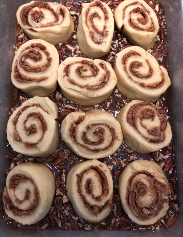 Preheat oven to 350 degrees. Spread the softened butter over the rolled out dough. Whisk together the brown sugar, cinnamon, dash of nutmeg & 1/2 cup of the toasted pecan pieces. Spread evenly over buttered dough. Beginning with the edge closest to you, roll the dough into a tight, 18 inch long spiral. Very gently, using floss and/ or a string (or even a serrated knife sawing gently) cut into 1 1/2 inch sections so that you have 12 rolls. Place rolls on caramel/ pecan sauce.