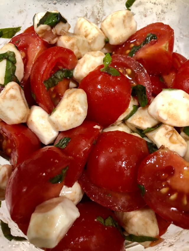 The first time I posted about caprese salad it was for a serving of one. I would pack this for lunch during the summertime. It is no longer summer, but I don’t ascribe to the notion certain foods and/ or dishes are only to be eaten according to the calendar. With this dish, I can make a generous bowl of it, eat some now, keep it in the refrigerator, & eat some later.