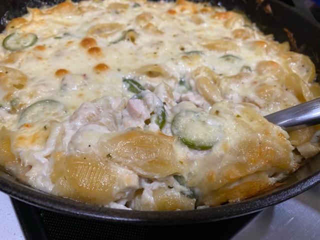 Need a little comfort food & spice in your life? Say no more. Discussions about what to eat for dinner is a daily staple. Chris, ever the lover of Mac & Cheese, requested white mac’n’cheese with a kick to it. A little internet perusing landed me to http://www.theviewfromgreatisland.com a blog I regularly check out. I opted to throw in some rotisserie chicken & we were both pleased with the results.