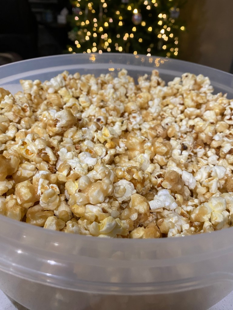 Preheat the oven to 200° F. Pour the bags of popped popcorn (removing any un-popped kernels) into a large roasting pan.