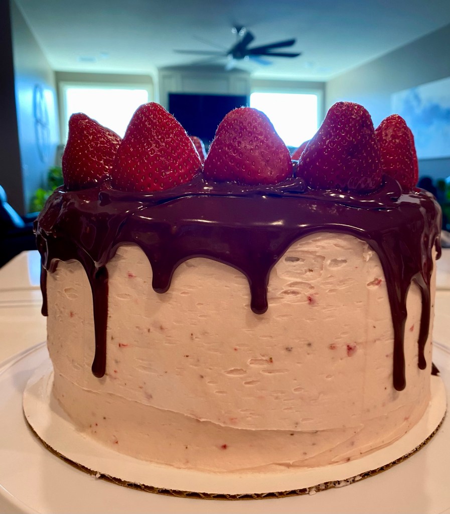 Add the chopped chocolate into a microwave safe container, pour cream over top, & microwave in 60 second intervals, whisking after each interval until completely melted & smooth. Allow to cool slightly before pouring over the top of the cake, letting it drip down the sides. Top with fresh strawberries & chill a minimum of 30 minutes before serving.