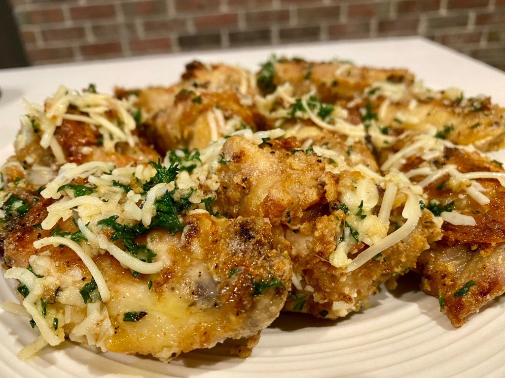 When the wings are done cooking, transfer them to a clean bowl, drizzle garlic butter mixture over the wings, add in the Parmesan cheese, & toss to coat evenly.