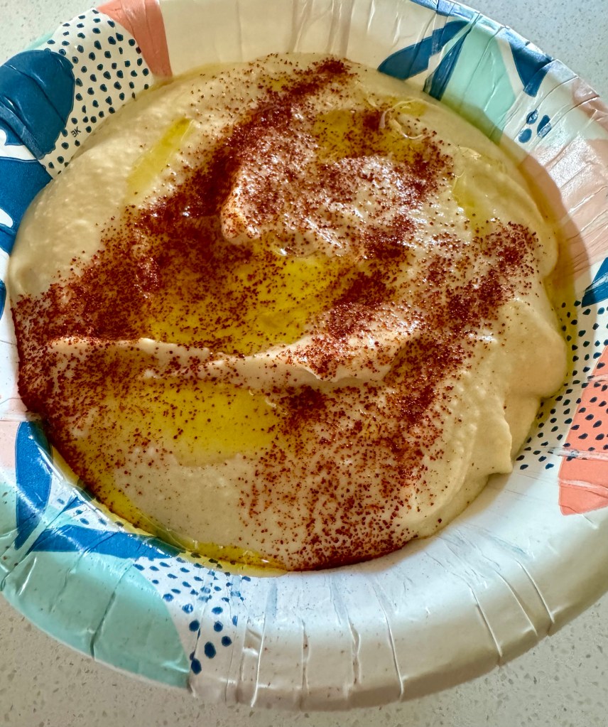 Transfer beans to a food processor & pulse a few times until course & mealy. Scrape down the sides, add the garlic cloves, juice of lemon, sea salt, & tahini. Blend for 3-5 minutes. Add in 3 ice cubes to emulsify. Blend until incorporated. Transfer to a bowl. Top with smoked paprika & drizzle with olive oil.