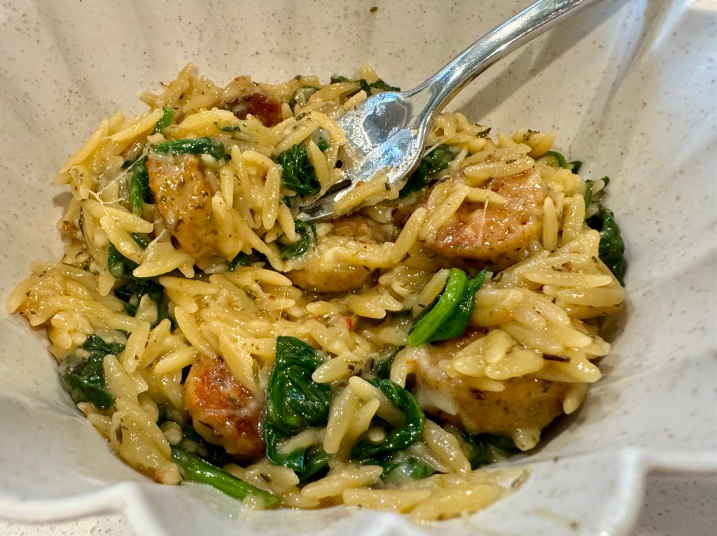 Drizzle olive oil over a large skillet, bring to medium high heat, add chicken sausage, & cook/ heat for 6-7 minutes, until lightly browned. Add minced garlic & sauté for 30 seconds, stirring to ensure it doesn’t burn. Stir in orzo to toast for 60 seconds. Pour in chicken broth, heavy cream, & seasonings; mix well. Bring mixture to a boil, then reduce heat, cover & simmer for 10-12 minutes; stirring occasionally until orzo is tender & liquid is mostly absorbed. Stir in spinach leaves until wilted. Top with freshly grated Parmesan cheese.