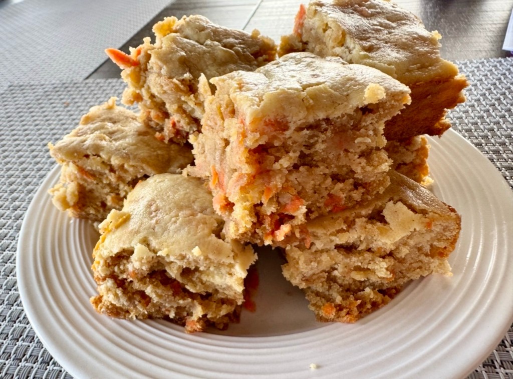 This dessert is subtlety sweet; not at all like carrot cake, in my opinion. I have a carrot cake recipe on here that is stellar & quite sweet. This recipe, while good, is much more subdued than traditional carrot cake – good for breakfast (not to imply I haven’t also had traditional carrot cake for breakfast. If you know, you know!) If you want it sweeter, just increase the sugar in the cream cheese; if so, I’d opt for powdered sugar.